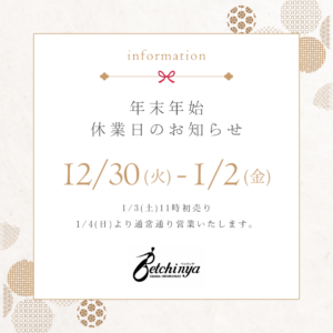 ☆☆☆ 年末年始休業のお知らせ ☆☆☆ ・12/30(火)・12/31(水)・1/1(木)・1/2(金) 上記4日間、お休みさせて頂きます🙇♀️ご了承下さいませ […]