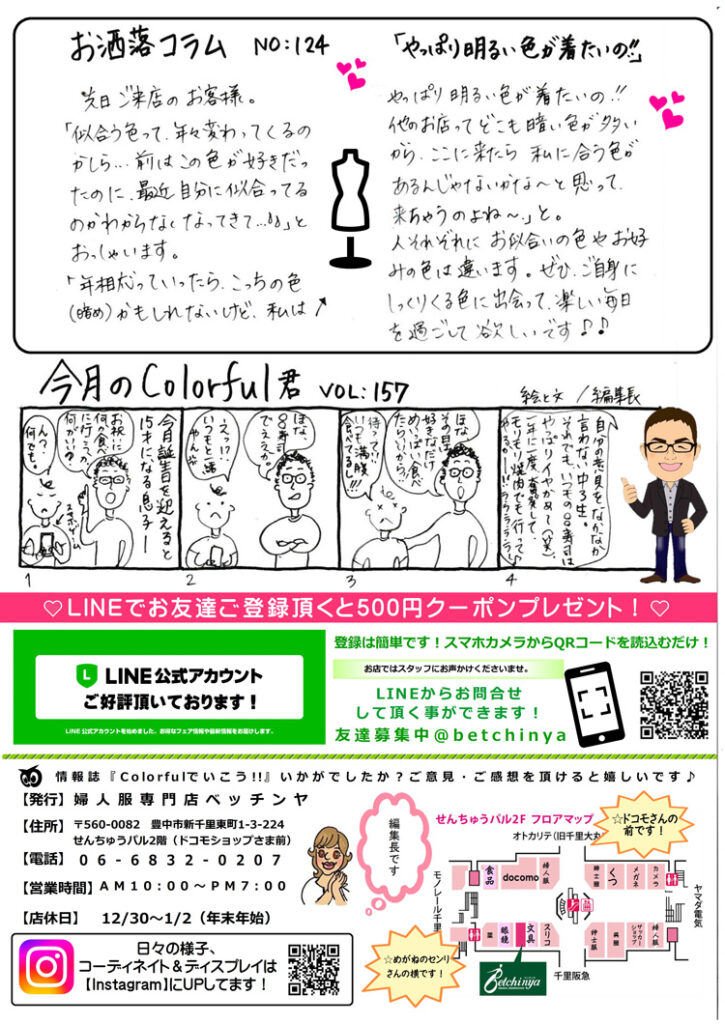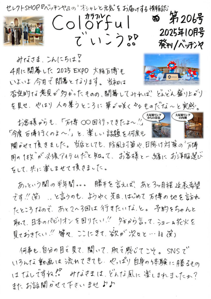 Colorfulでいこう!!(2025年10月号) 2025年10月1日 最終更新日時 : 2025年10月1日 管理者 ★毎月1日発刊のベッチンヤ気まぐれ情報紙です!お店でもお渡ししております! 令和7年10月第206号ニュースレター発刊しました。・大阪万博行かれましたか!・10月のコーデをご紹介!・お洒落コラム「やっぱり明るい色着たいの!!」・今月のカラフルくん ※各紙面をクリック(タップ)するとページごとの拡大表示がされます。スマホの場合はその後ピンチアウト(2本指で広げる動作)で拡大することができます。 FacebookX