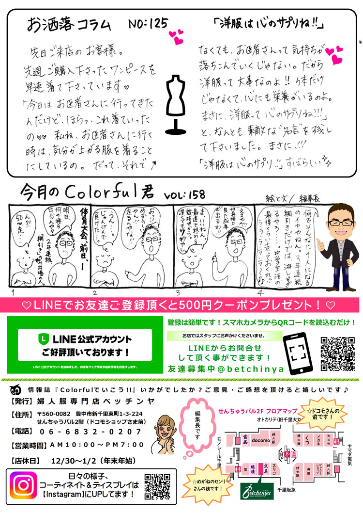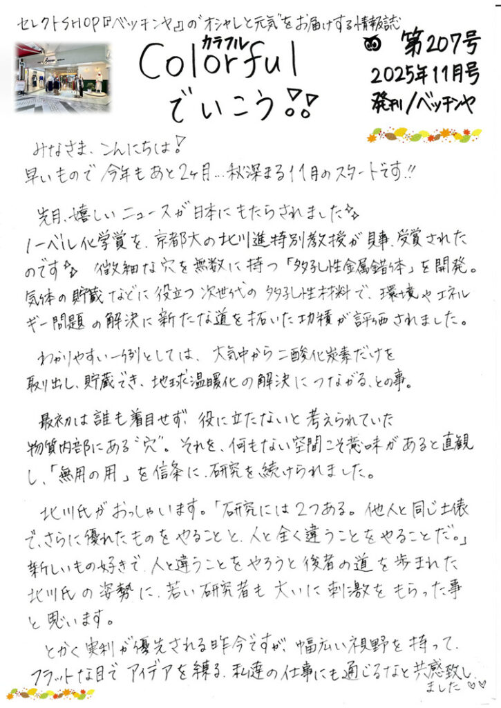 Colorfulでいこう!!(2025年11月号) 2025年11月1日 最終更新日時 : 2025年10月31日 管理者 ★毎月1日発刊のベッチンヤ気まぐれ情報紙です!お店でもお渡ししております! 令和7年11月第207号ニュースレター発刊しました。・「無用の用」でノーベル化学賞受賞!・11月秋の店舗コレクションをご紹介!・お洒落コラム「洋服は心のサプリね!!」・今月のカラフルくん ※各紙面をクリック(タップ)するとページごとの拡大表示がされます。スマホの場合はその後ピンチアウト(2本指で広げる動作)で拡大することができます。 FacebookX
