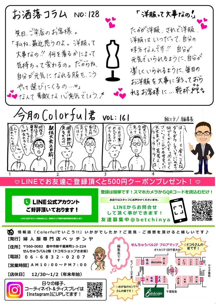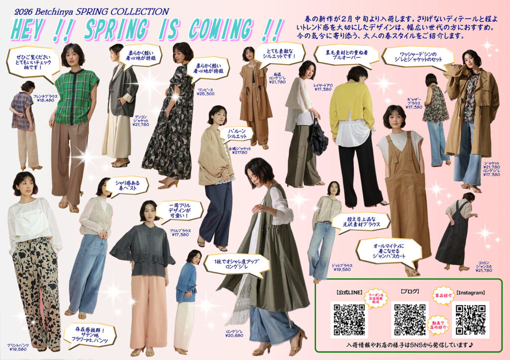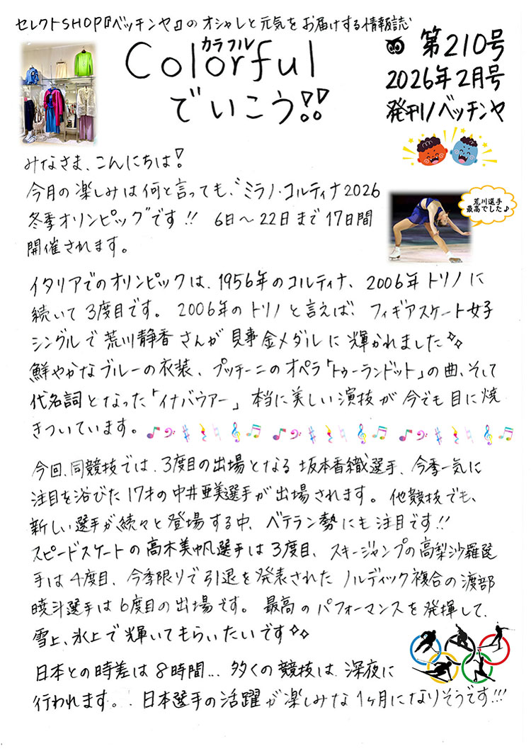Colorfulでいこう!!(2026年2月号) 2026年1月31日 最終更新日時 : 2026年1月30日 管理者 ★毎月1日発刊のベッチンヤ気まぐれ情報紙です!お店でもお渡ししております! 令和8年2月第210号ニュースレター発刊しました。・2月はミラノ・コルティナ2026 冬季オリンピック開催です!・春の新作が2月中旬より入荷!大人の春スタイルをご紹介。・お洒落コラム「洋服って大事なの!」・今月のカラフルくん ※各紙面をクリック(タップ)するとページごとの拡大表示がされます。スマホの場合はその後ピンチアウト(2本指で広げる動作)で拡大することができます。 FacebookX