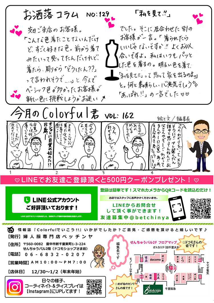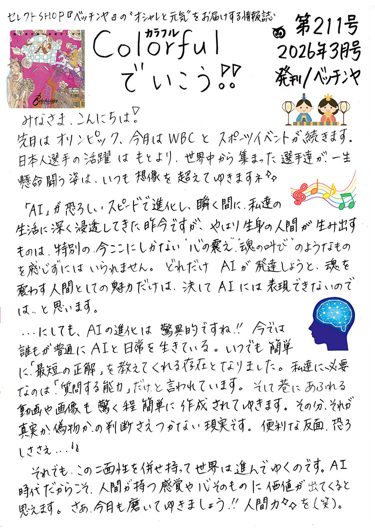 Colorfulでいこう!!(2026年3月号) 2026年2月27日 最終更新日時 : 2026年2月27日 管理者 ★毎月1日発刊のベッチンヤ気まぐれ情報紙です!お店でもお渡ししております! 令和8年3月第211号ニュースレター発刊しました。・AIを使い始めて思う自分の人間力。・この春もやっぱりブラウス&ワンピース!リバティプリント着てみませんか!・お洒落コラム「私を見て!!」・今月のカラフルくん ※各紙面をクリック(タップ)するとページごとの拡大表示がされます。スマホの場合はその後ピンチアウト(2本指で広げる動作)で拡大することができます。 FacebookX
